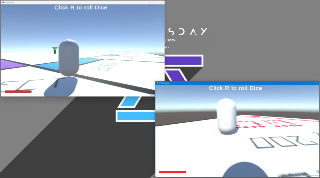 FPS Monopoly started as a Unity college project based off of the game FPS Chess, to use a life-size board with huge dice that the player has to throw to determine their move. The plan was to integrate the ability to have the choice when you land on an owned piece between paying rent, or fighting the owner where if you win, you don’t have to pay rent and if you lose, you have to pay double rent. This system could even be branched out to include discounts when trading properties with players and the existing AI could be improved to enable the prior mentioned system to get free utilities and lighting, or pay double if you lose. However I soon realised that, especially at my current Unity abilities, the scale for this project was astronomically big so the project morphed into a sandbox for me to do the class work and try to learn how to integrate Photon successfully.