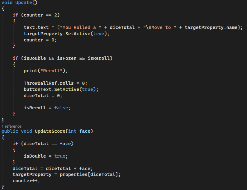 As explained, this project was designed to follow the basic gameplay loop of monopoly, where the player rolls 2 dice and moves forward that number of spaces landing on a property. Therefore this is where I started before the project changed direction. To achieve this I started by adding the ability to throw some dice, instantiating a die prefab with a trigger on each face just in front of the player with a random rotation and then adding a force to it’s Rigidbody. To give slightly more control to the player and improve engagement, I made it so that the longer you hold down the throw button, the bigger the force applied to the die and therefore the further it will go and the more aggressively it will bounce off of the board bounds. On each die is a script that checks if the die has stopped moving by comparing its position every half second and when it has, it checks through an array of triggers on each face in a for loop to determine which face is in contact with the floor. This returns the upwards facing face to the Game Manager which adds up the 2 rolls of the player and displays this clearly on the screen. It then sets a trigger on the target property active, with a script that freezes the player in place when entered to stop them moving after their turn.
